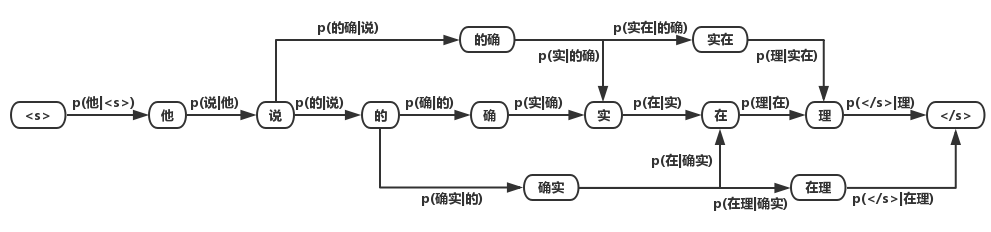 \[p(他说的确实在理)=p(他)p(说|他)p(的|他说)...p(理|他说的确实在)\]而要真正计算“他说的确实在理”出现的概率,就必须计算出上述所有形如$p(w_n|w_1…w_{n-1})\quad n=1,…,6$ 的概率,计算量太过庞大,因此我们近似地认为: