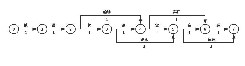 最短路径分词算法首先将一句话中的所有词匹配出来,构成词图(有向无环图DAG),之后寻找从起始点到终点的最短路径作为最佳组合方式。