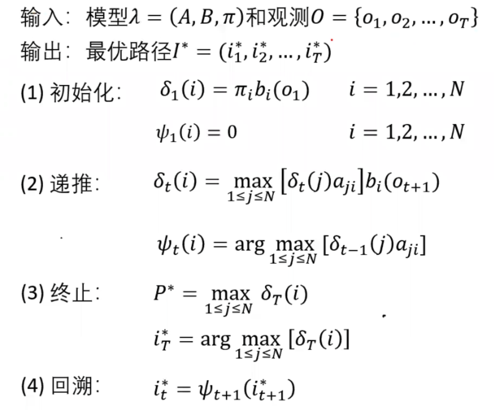 - HMM三个基本问题如下,其中$O$为观测序列,$I$为状态序列,$\lambda$为模型,$\pi,A,B$分别为模型参数即初始状态概率、状态转移矩阵、观测概率矩阵: